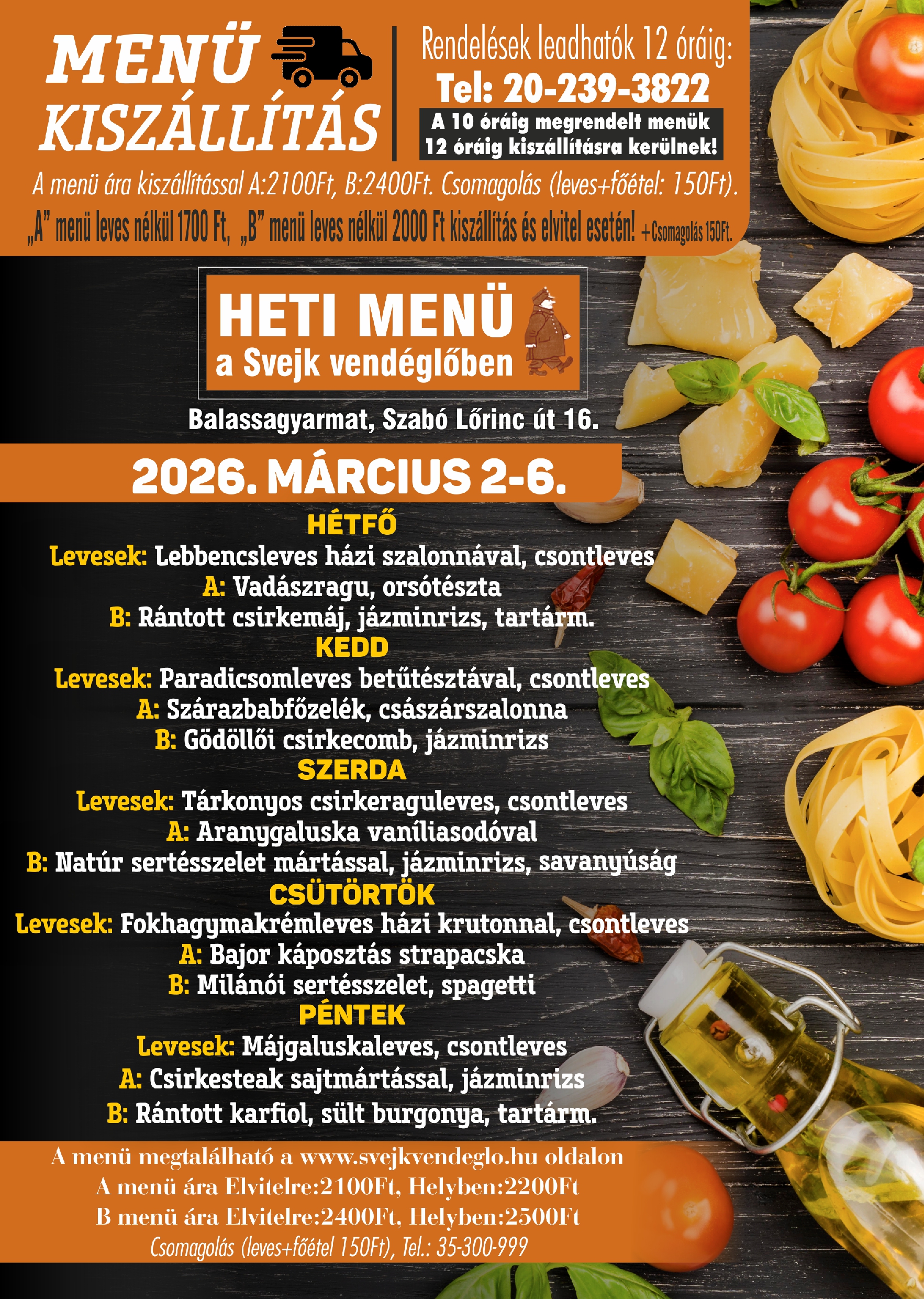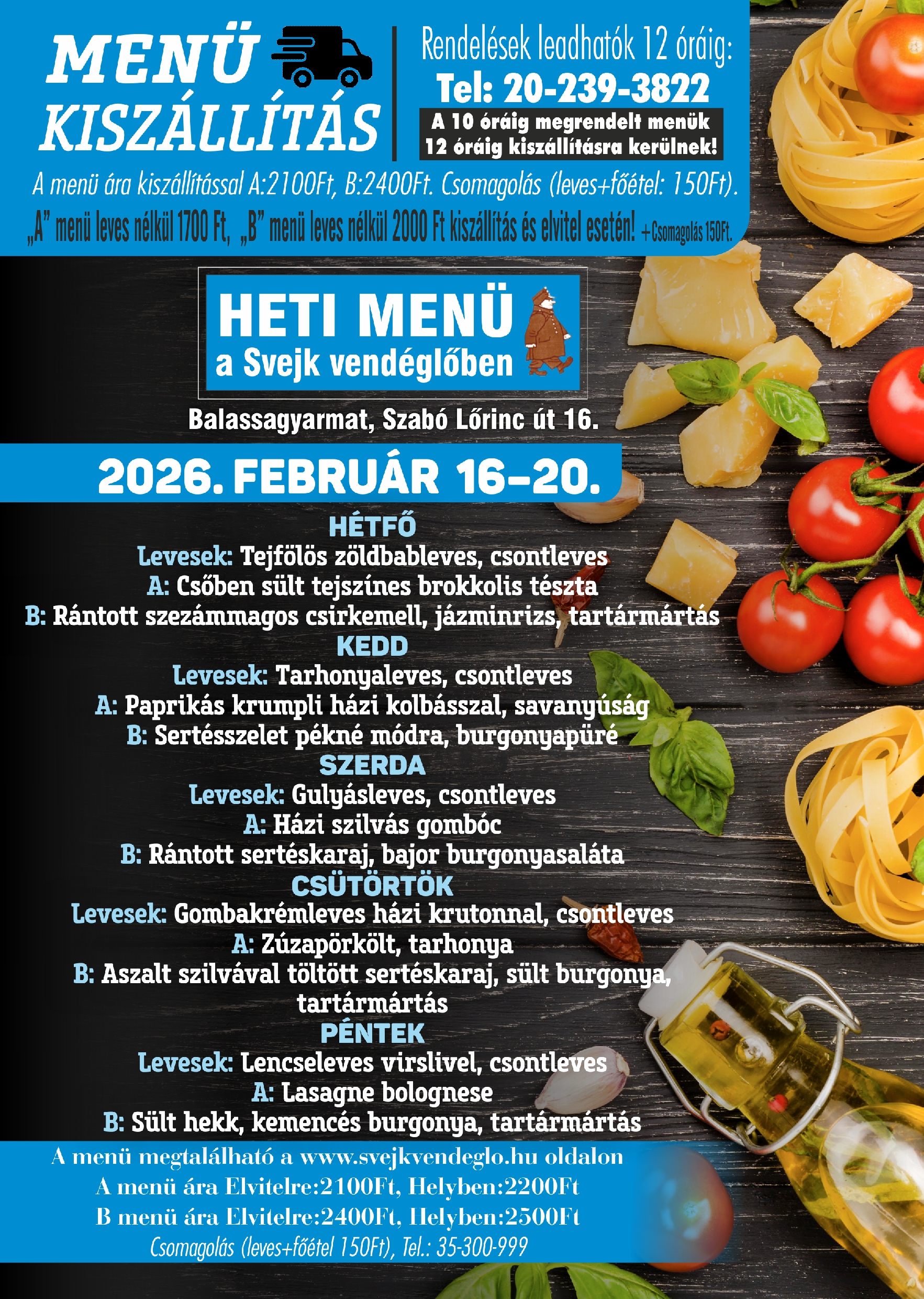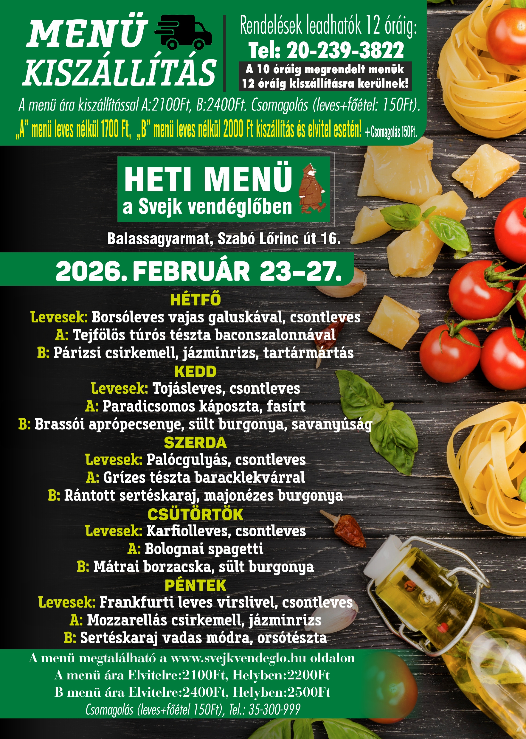 Allergének jelölése az étlapon: 1. glutén, 2. rákfélék, 3. tojás, 4. halak, 5. földimogyoró, 6. szója, 7. tej, 8. diófélék, 9. zeller, 10. mustár, 11. szezámmag, 12. kén-dioxid, 13. csillagfürt, 14. puhatestűek. Áraink 2025. február 8-tól visszavonásig érvényesek!